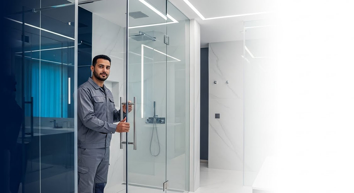 الزجاج — كبائن زجاجية، أبواب زجاج، واجهات سيكوريت 10–12 ملم مع تثبيت محكم وضمان على الإكسسوارات.